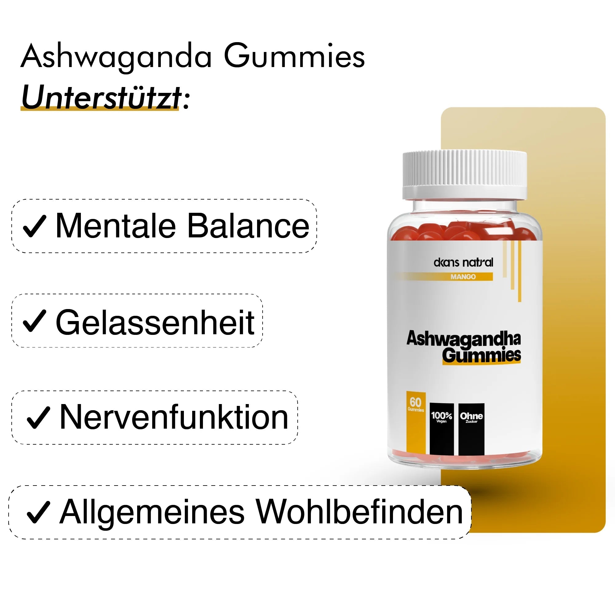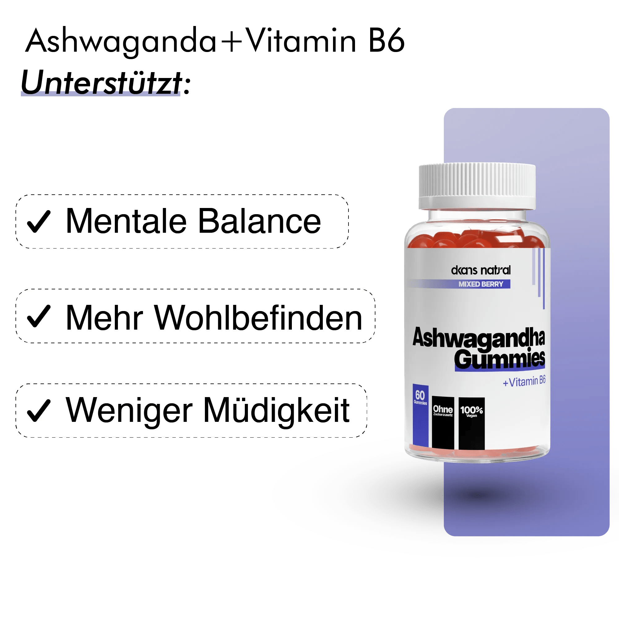 Unsere Ashwagandha + Vitamin B6 Gummies kombinieren hochwertigen Ashwagandha-Wurzelextrakt...